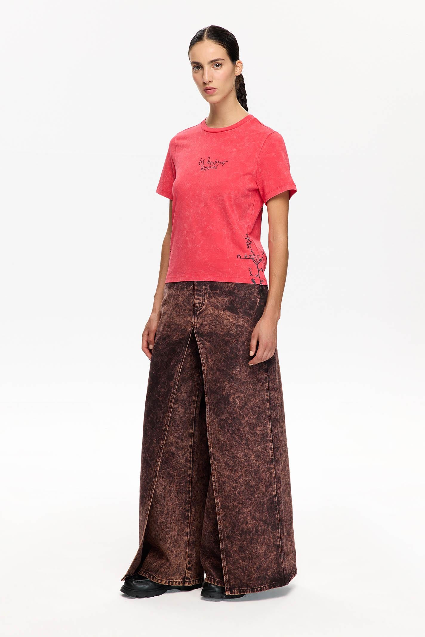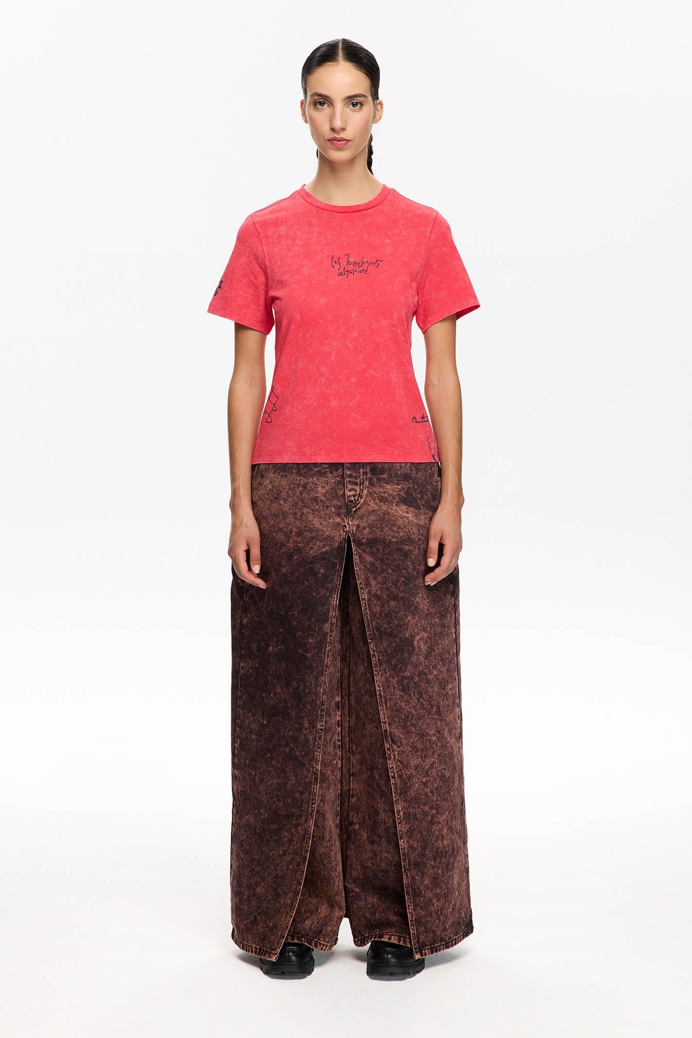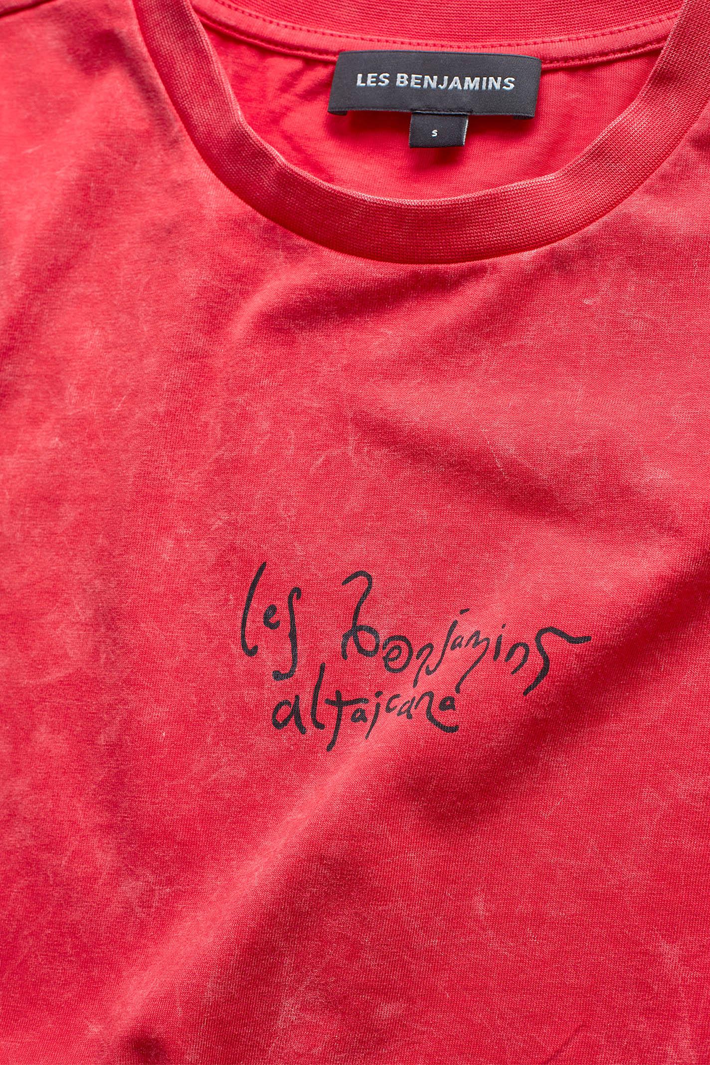 Kırmızı tonlarında, yıkamalı efektiyle dikkat çeken bu Les Benjamins tişört, orta boyutlu ön baskısı ile markanın imzasını taşıyor. Bisiklet yaka ve kısa kollu tasarımı, şehir hayatı ve sokak stiline uyum sağlarken, yumuşak jarse kumaşı hareket özgürlüğü sunar.