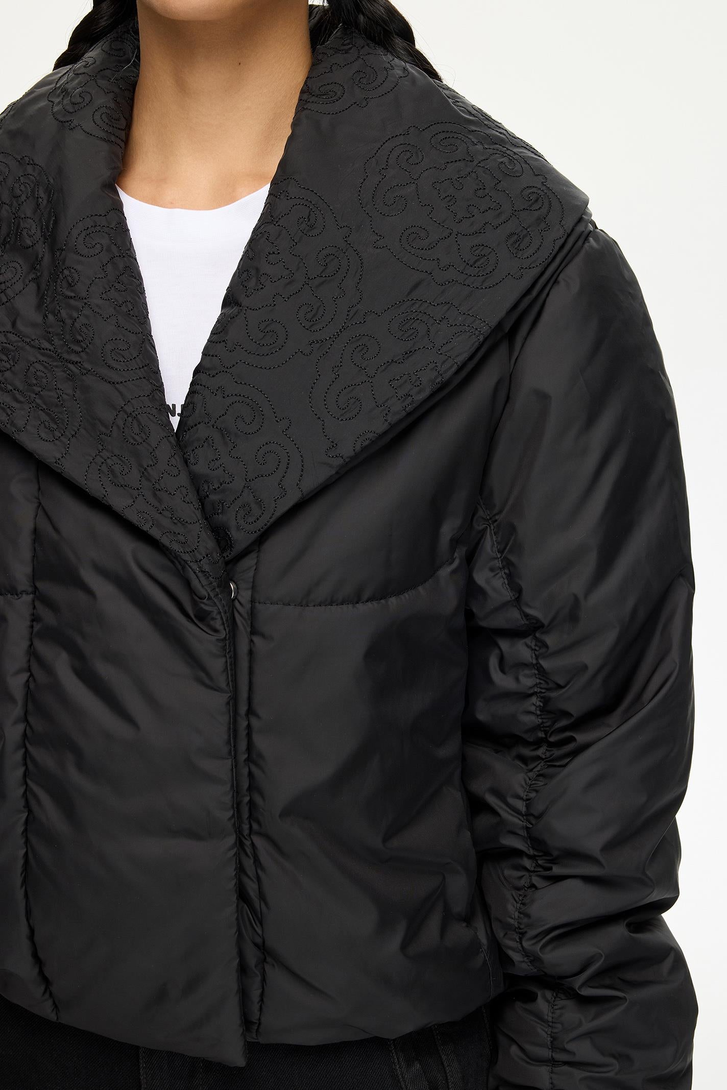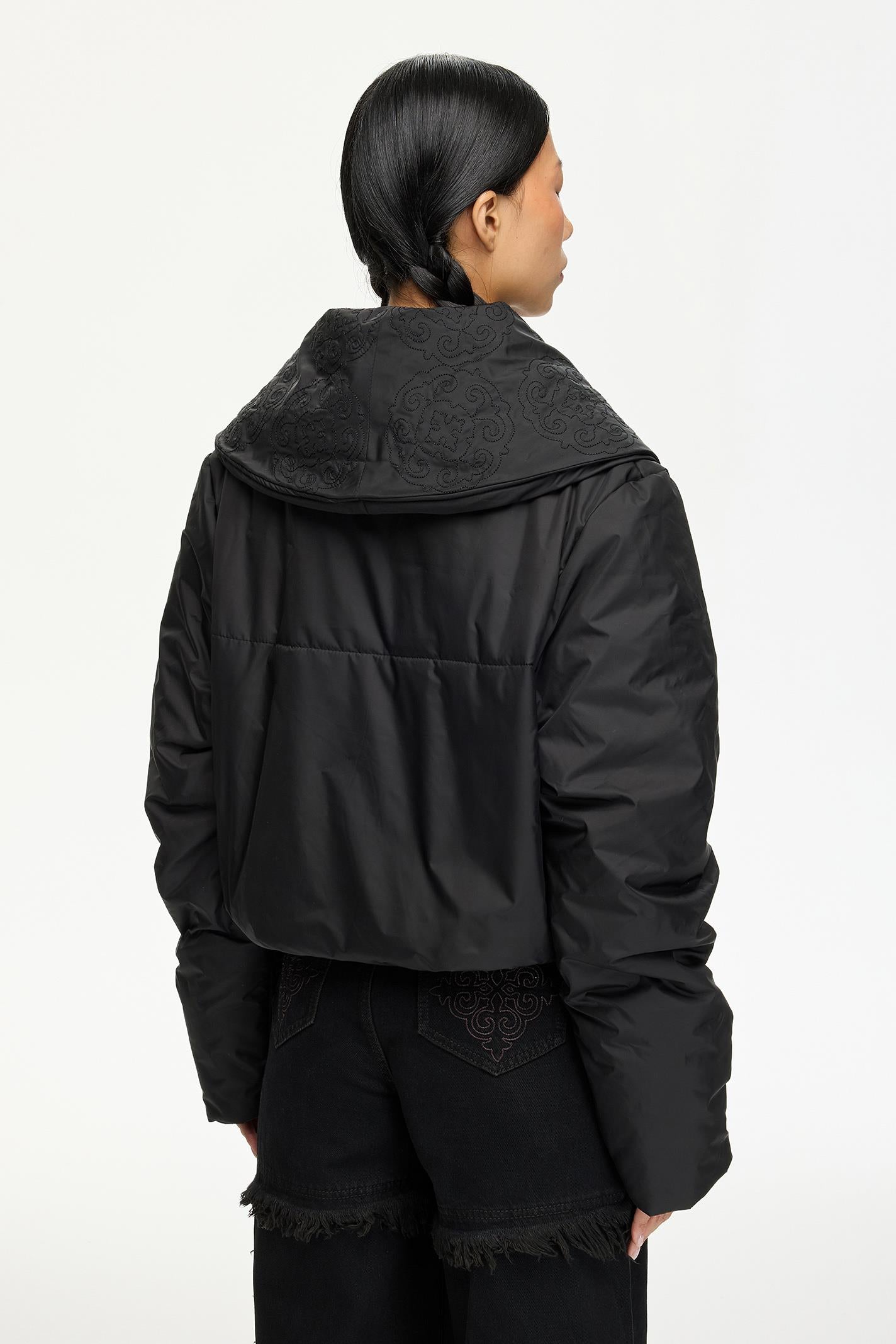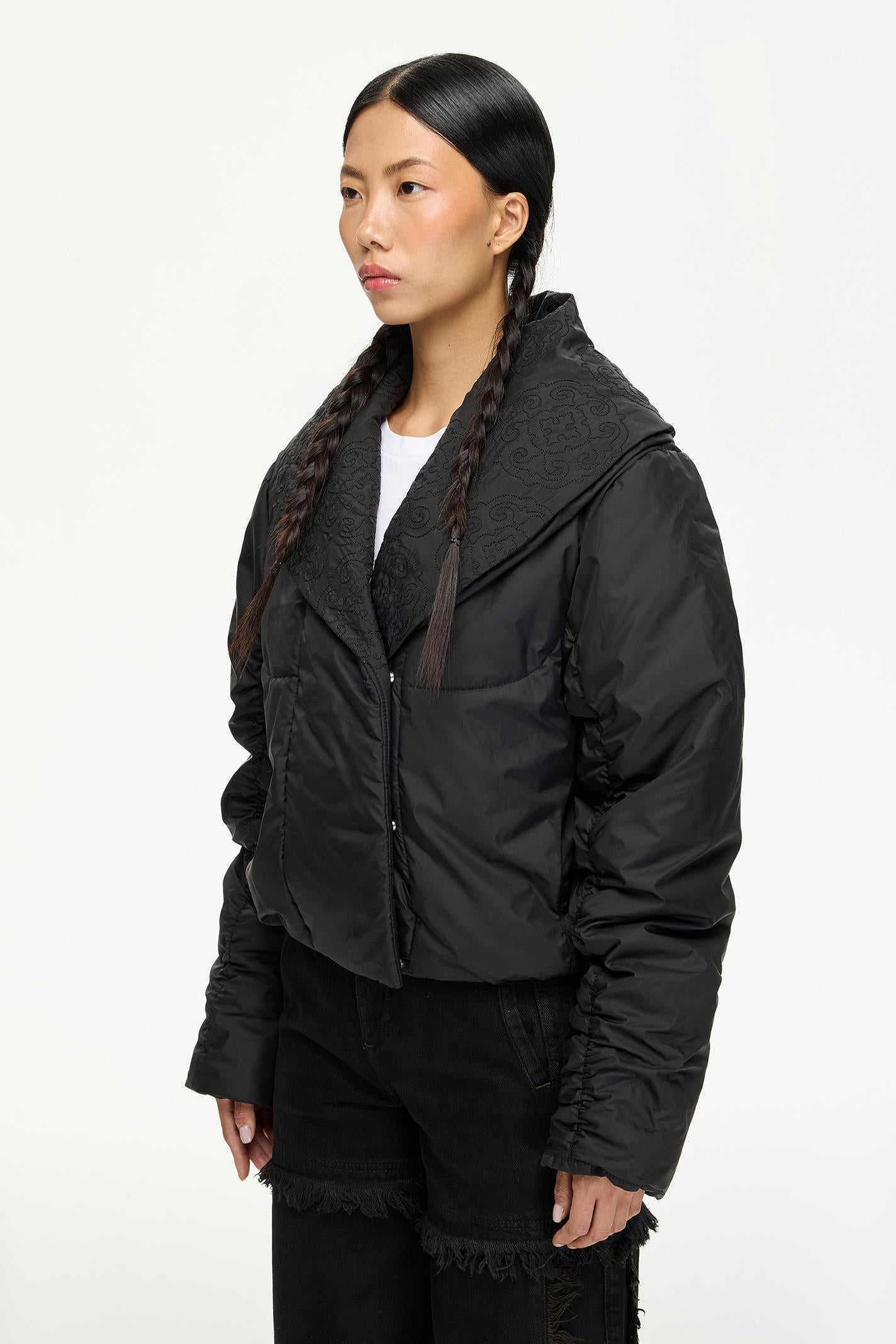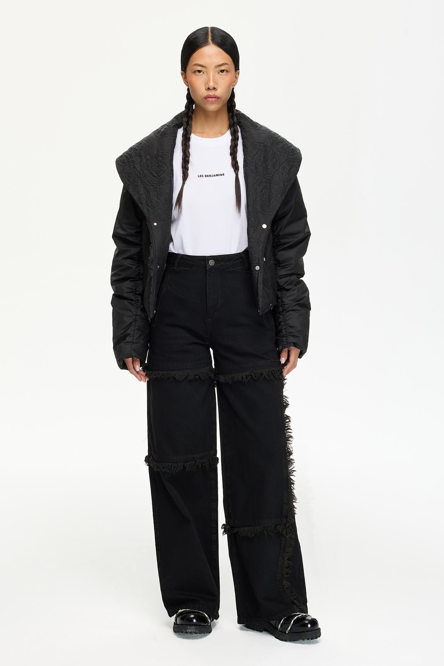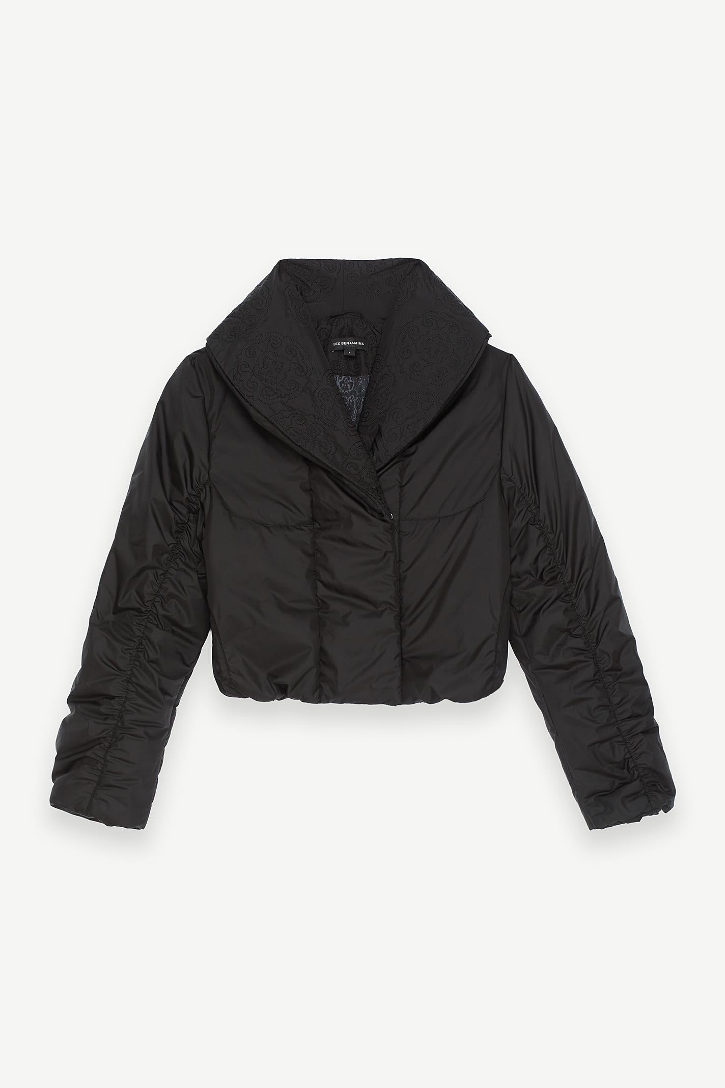 Minimalist siyah tasarımı ve crop oversized kesimiyle dikkat çeken bu Les Benjamins mont, şal yaka detayıyla sofistike bir dokunuş sunuyor. Hafif parlak dokulu, dayanıklı naylon kumaşı hareket özgürlüğü sağlarken, şehir hayatından gece kombinlerine uyum sağlar. Göğüste yer alan küçük Les Benjamins yazısı, tasarıma modern bir vurgu ekler.