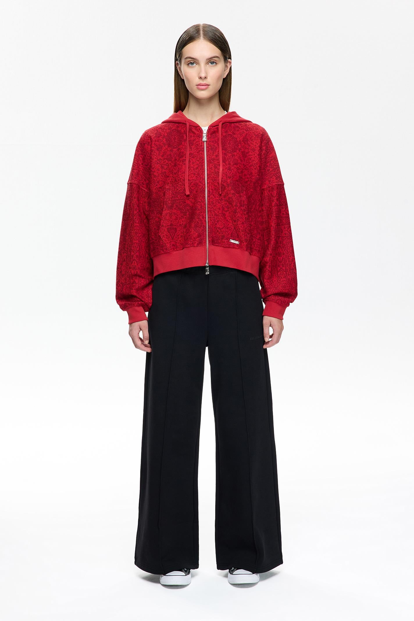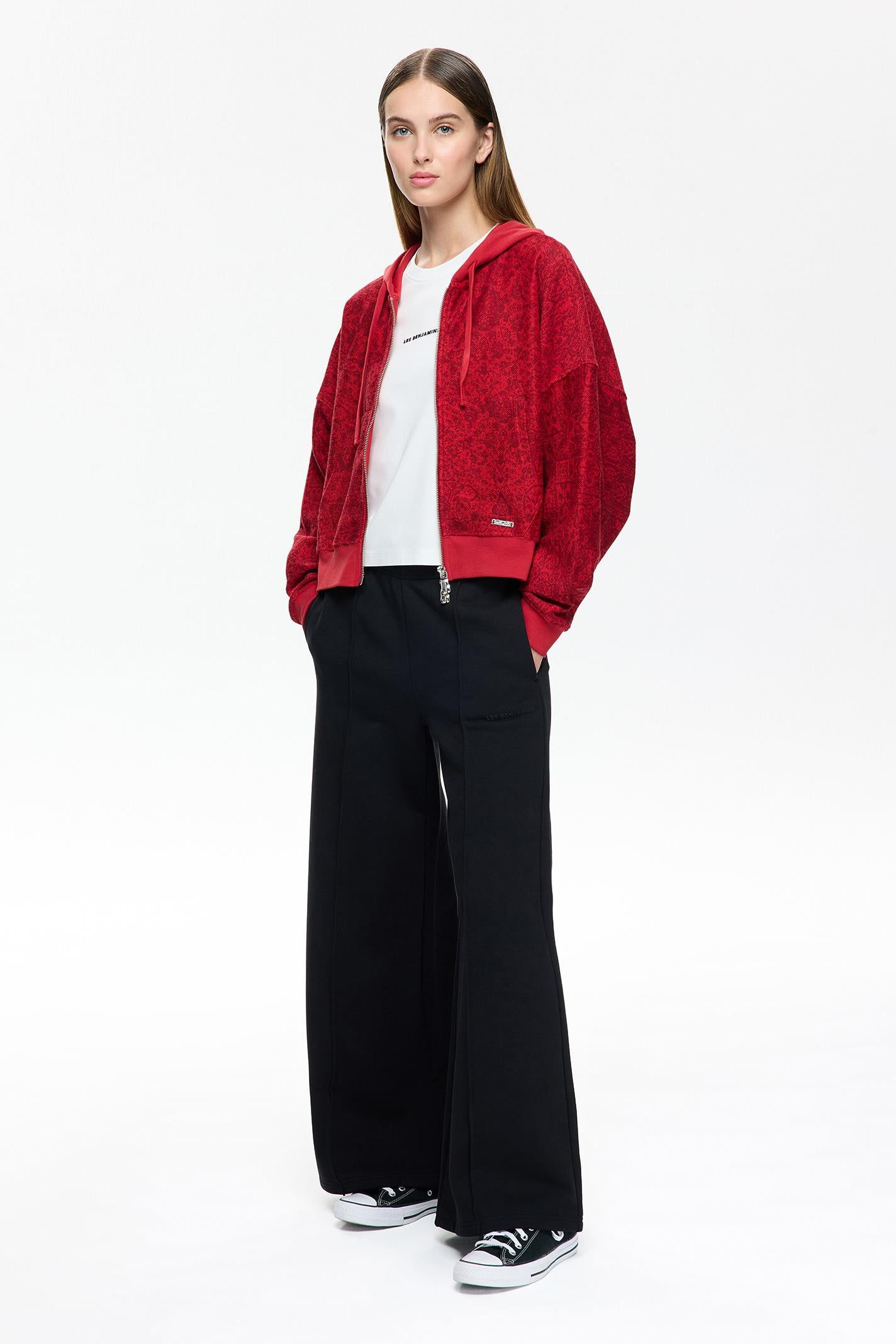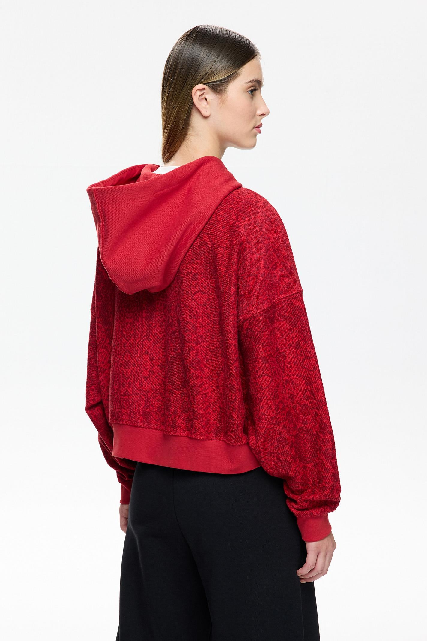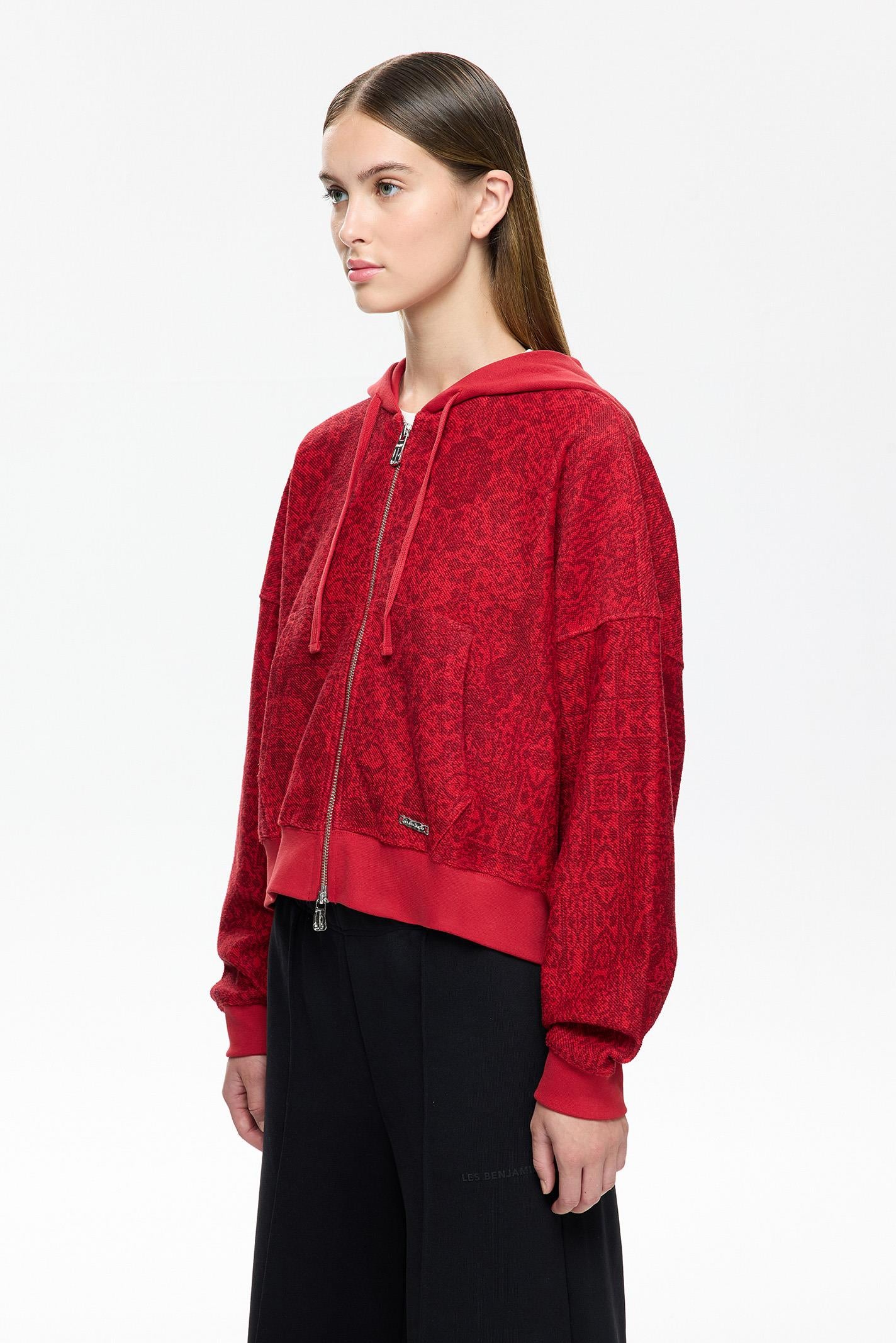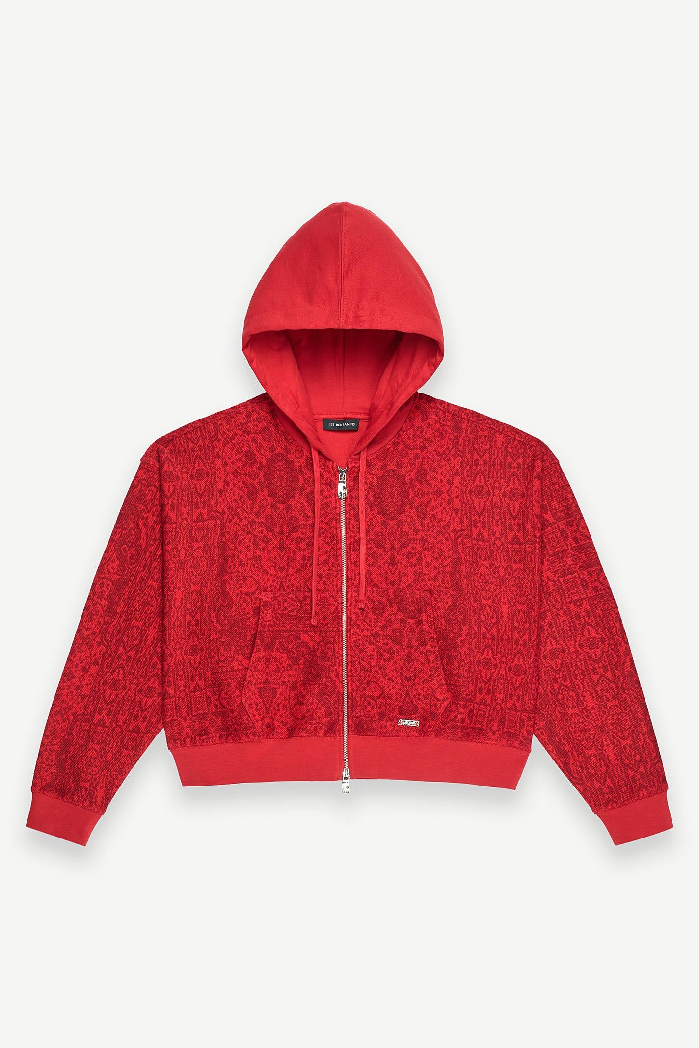 Kırmızı tonlarıyla dikkat çeken bu Les Benjamins crop oversized hoodie, kültürel desenlerin modern bir yorumunu sunuyor. Jersey kumaşı, hafifliği ve günlük konforu ile öne çıkarken, kapüşonlu yaka ve uzun kollar dinamik bir silüet yaratıyor. Ön yüzde yer alan küçük boyutlu Les Benjamins logosu, tasarıma zarif bir dokunuş katıyor. Kanguru cebi hem işlevsel hem de tasarım açısından güçlü bir detay. Şehir yaşamına uyumlu, hareket özgürlüğü sağlayan kesimiyle gün boyu stili ve rahatlığı bir arada sunuyor.