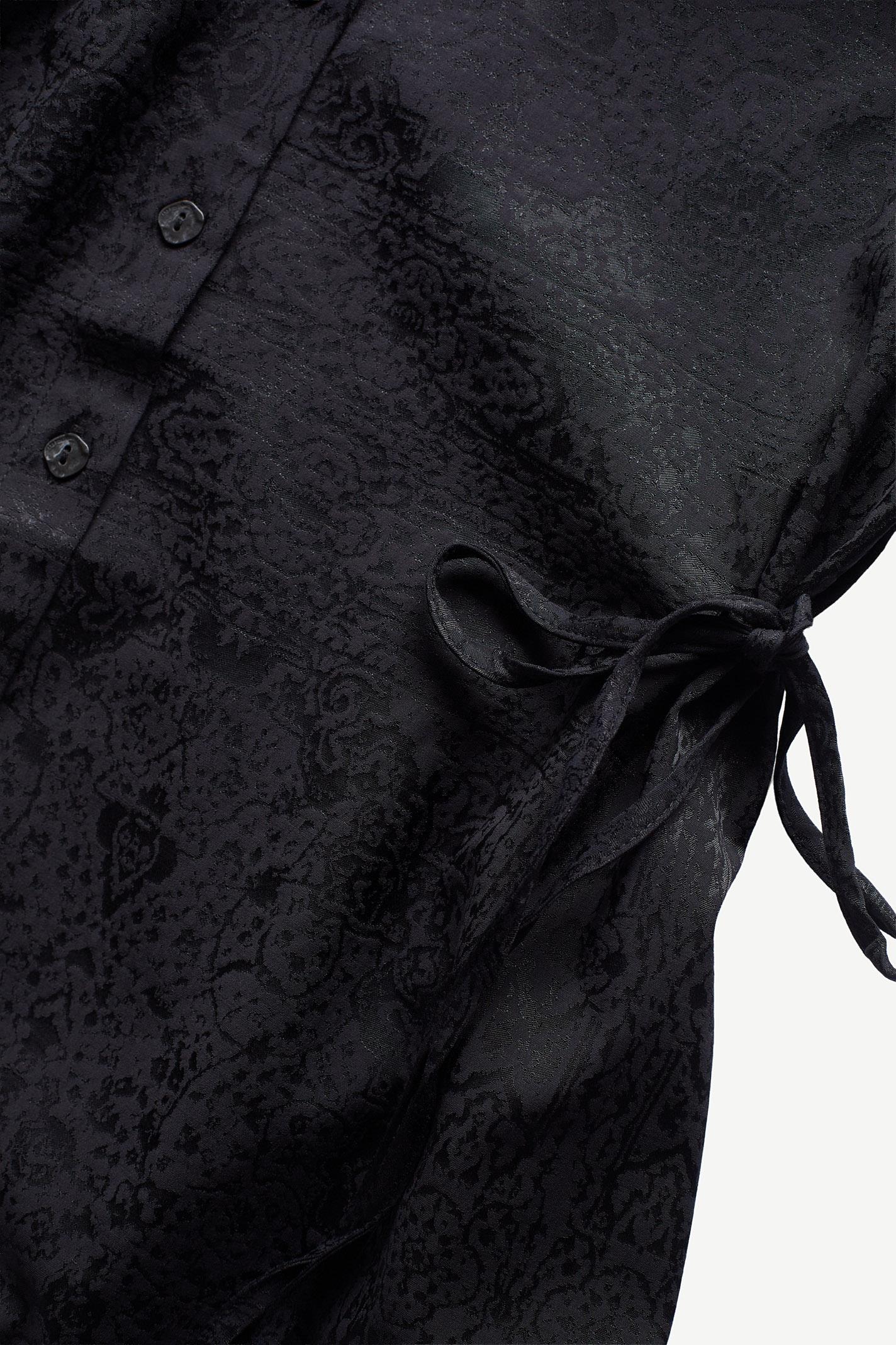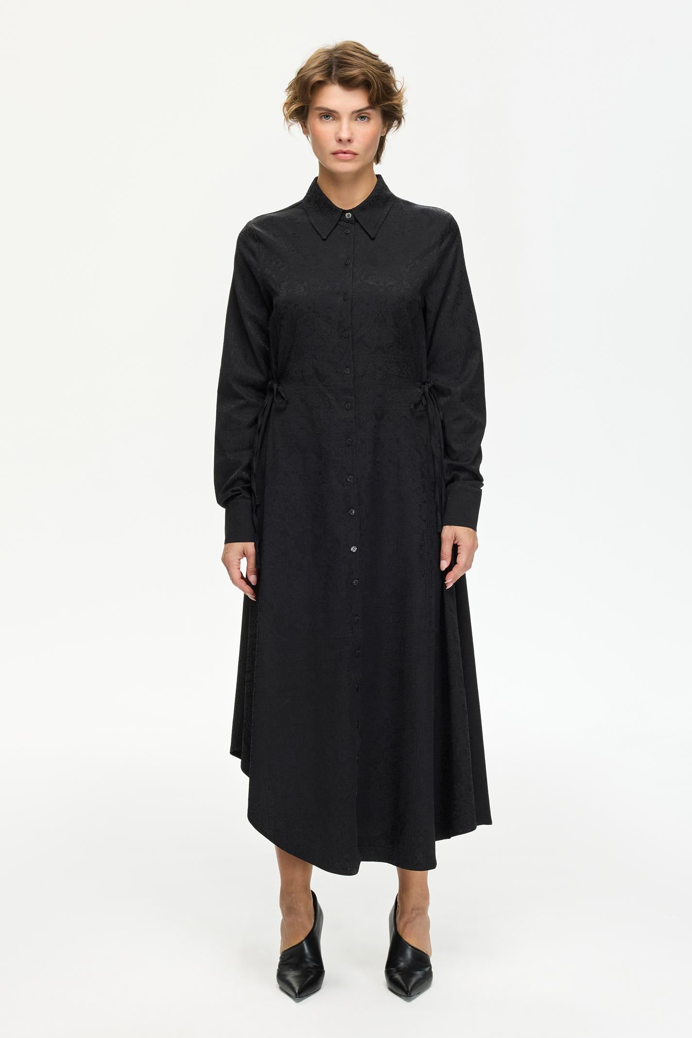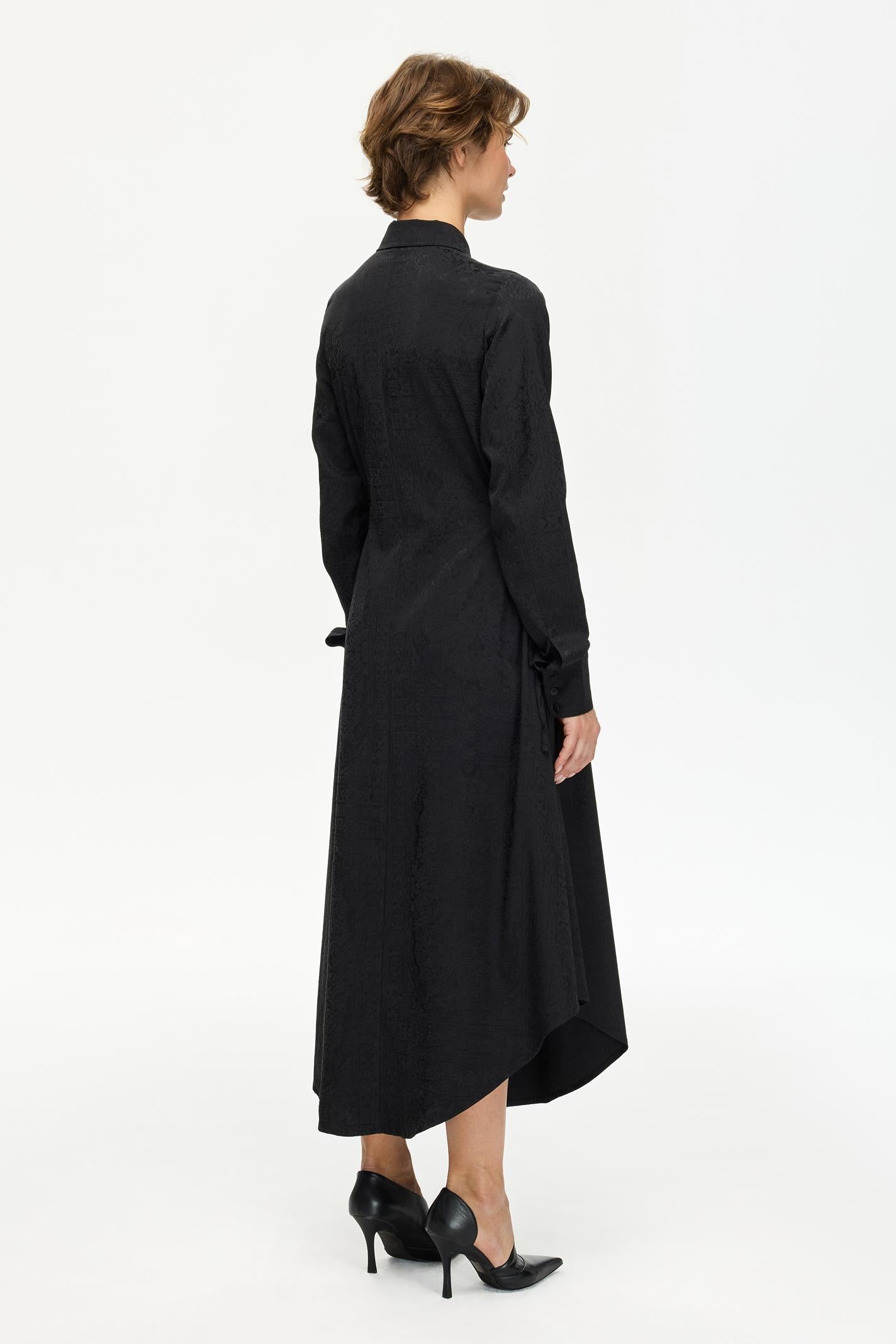 Minimalist bir estetikle tasarlanan bu siyah Les Benjamins elbise, gömlek yaka ve uzun kollu yapısıyla modern bir görünüm sunuyor. İnce dokusundaki ton-sur-ton desenler, tasarımı zarif bir şekilde detaylandırıyor. Yan bağlama detayları hareket kabiliyeti sağlarken, dökümlü jersey kumaş gün boyu konfor sunar. Küçük Les Benjamins logosu yaka içinde yer alır. Şehir hayatına uyum sağlayan bu tasarım, gündüzden geceye geçiş için ideal.