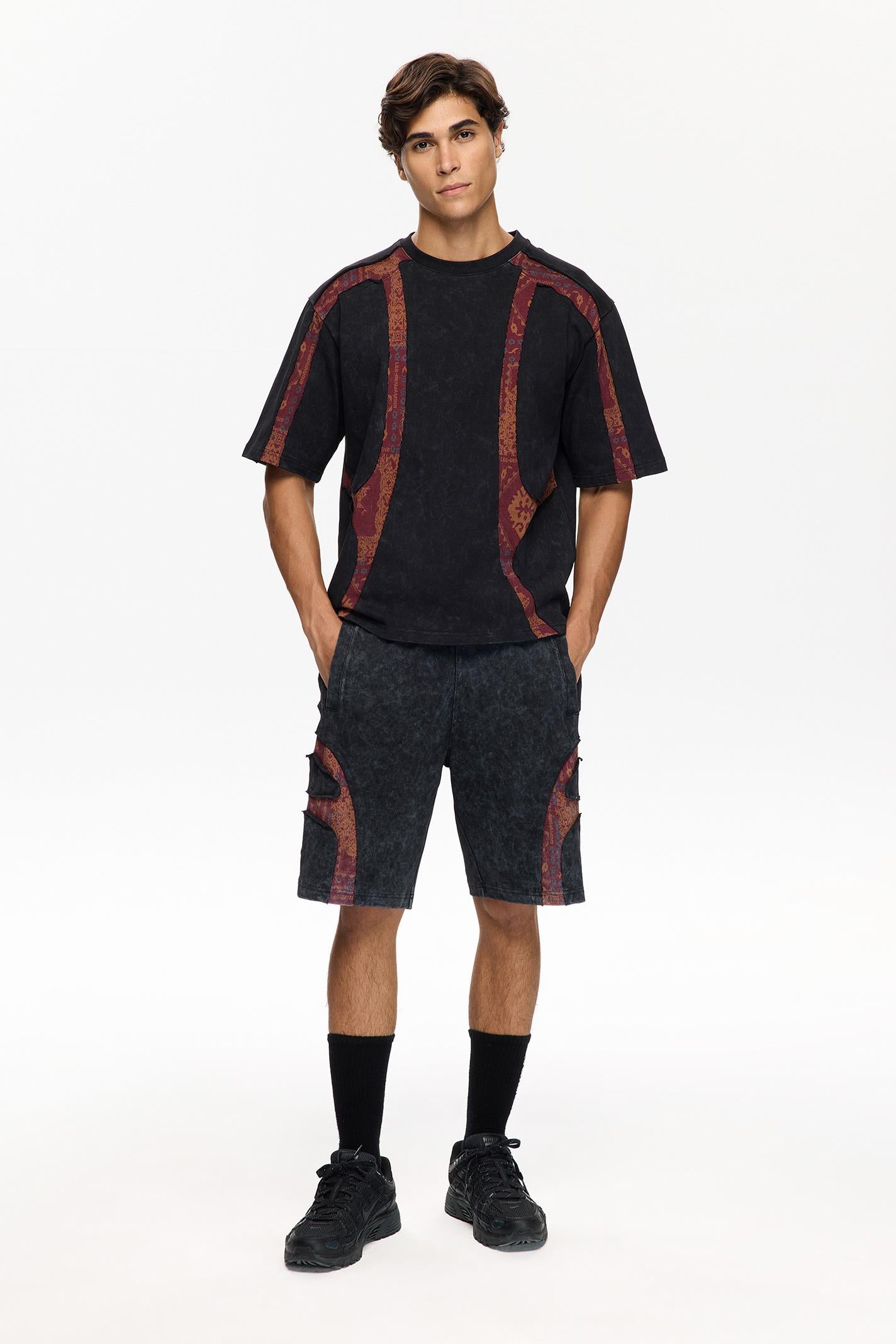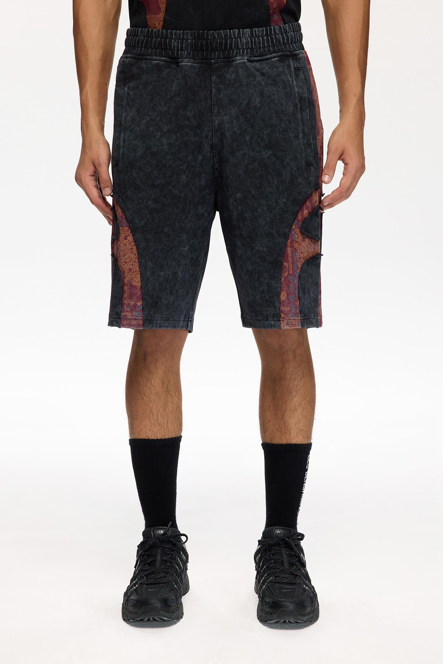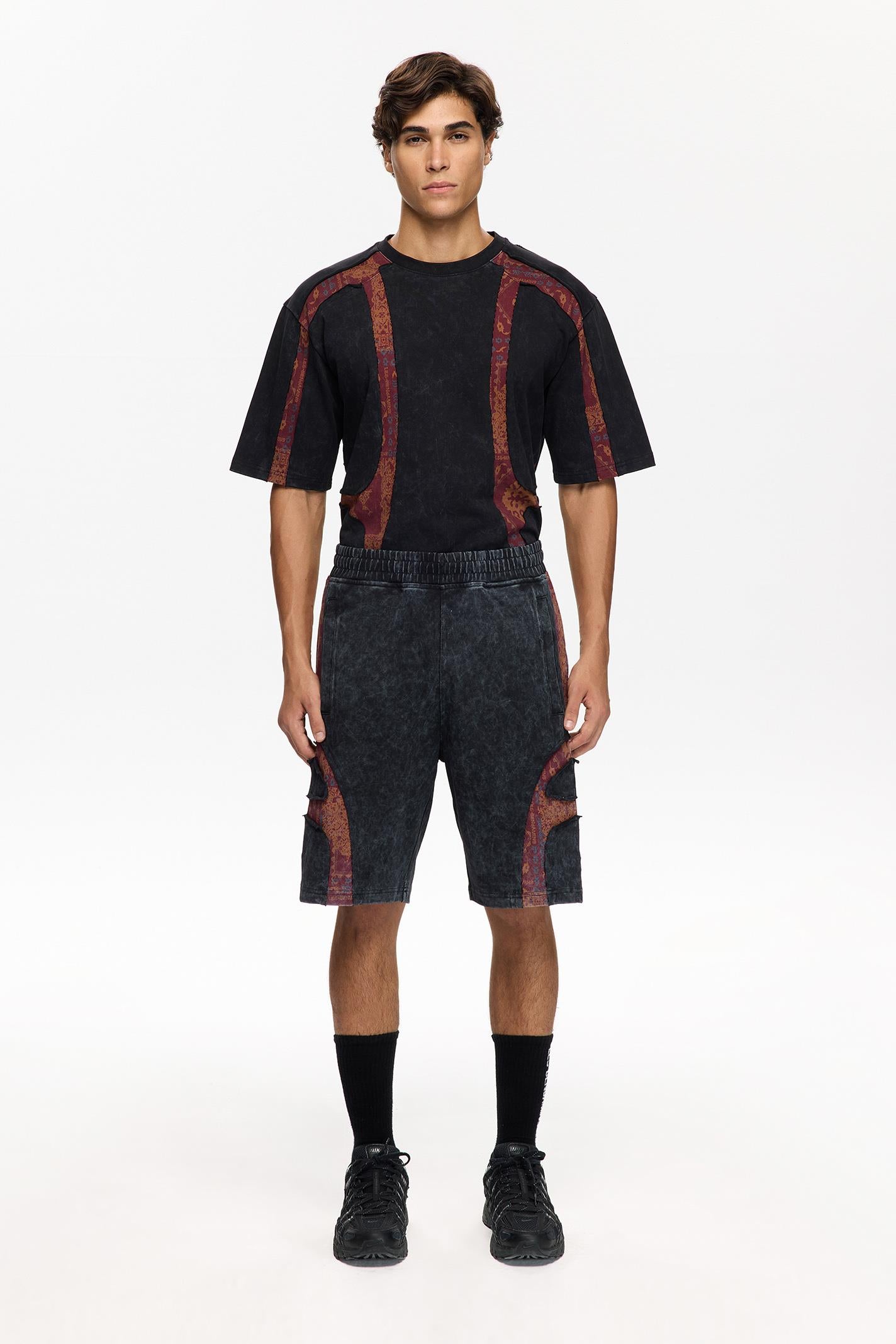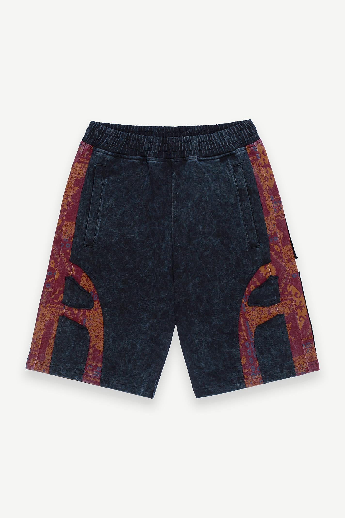 Les Benjamins şortu, koyu mavi tonlarıyla taşlanmış jersey kumaşın üzerine yan panellerde yer alan etnik desenler ve dinamik LES BENJAMINS baskısıyla dikkat çekiyor. Rahat kesimi ve elastik beli, şehir yaşamında ve sokak stilinde konforlu bir hareket alanı sunuyor.