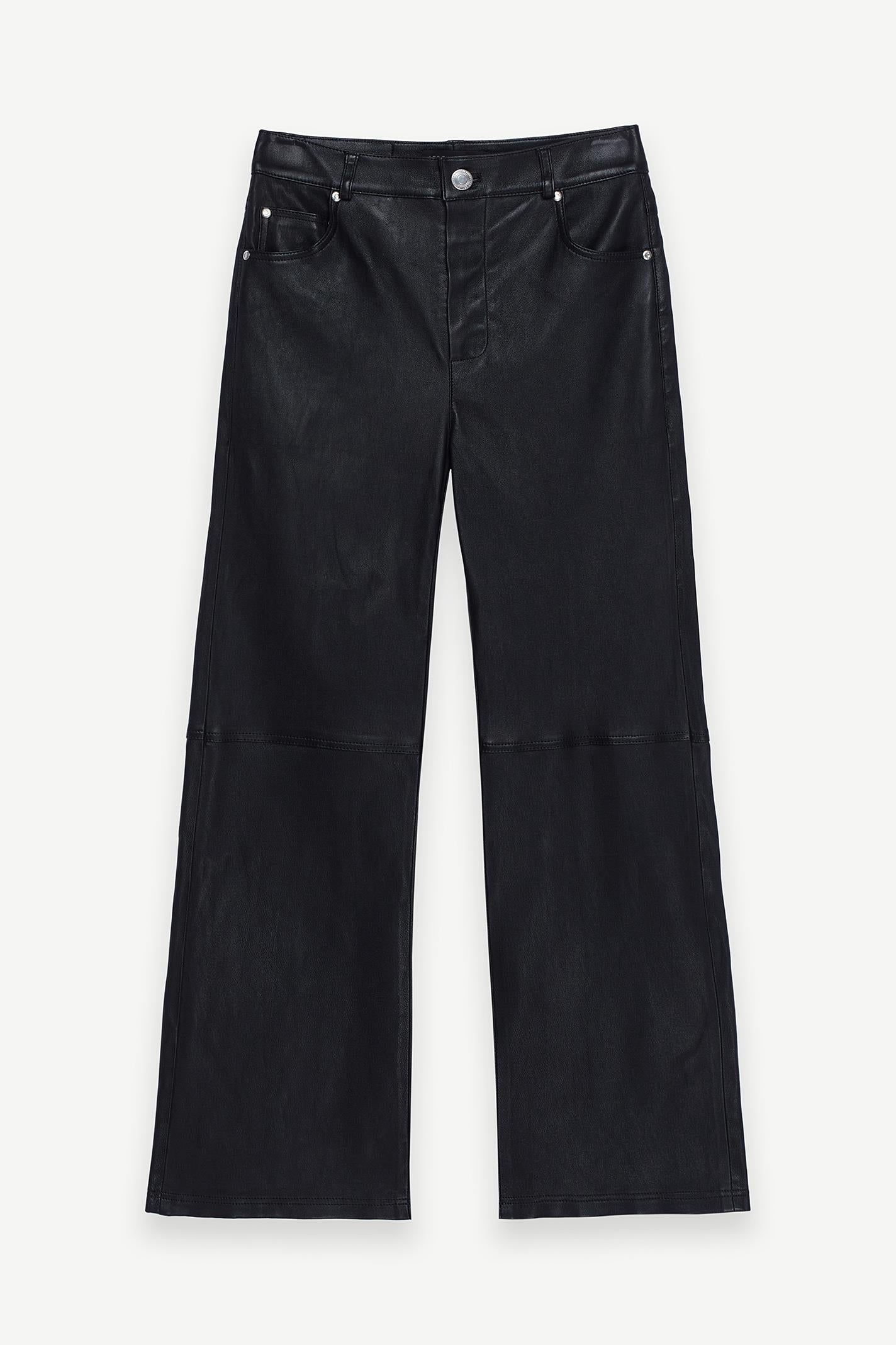 Siyah deri dokusu ve geniş paça kesimiyle bu Les Benjamins pantolon, şehir hayatına uyum sağlayan modern bir tasarım sunuyor. Klasik cep detayları işlevsellik katarken, esnek yapısı hareket özgürlüğü sağlıyor. Gün boyu konfor için tasarlandı.
