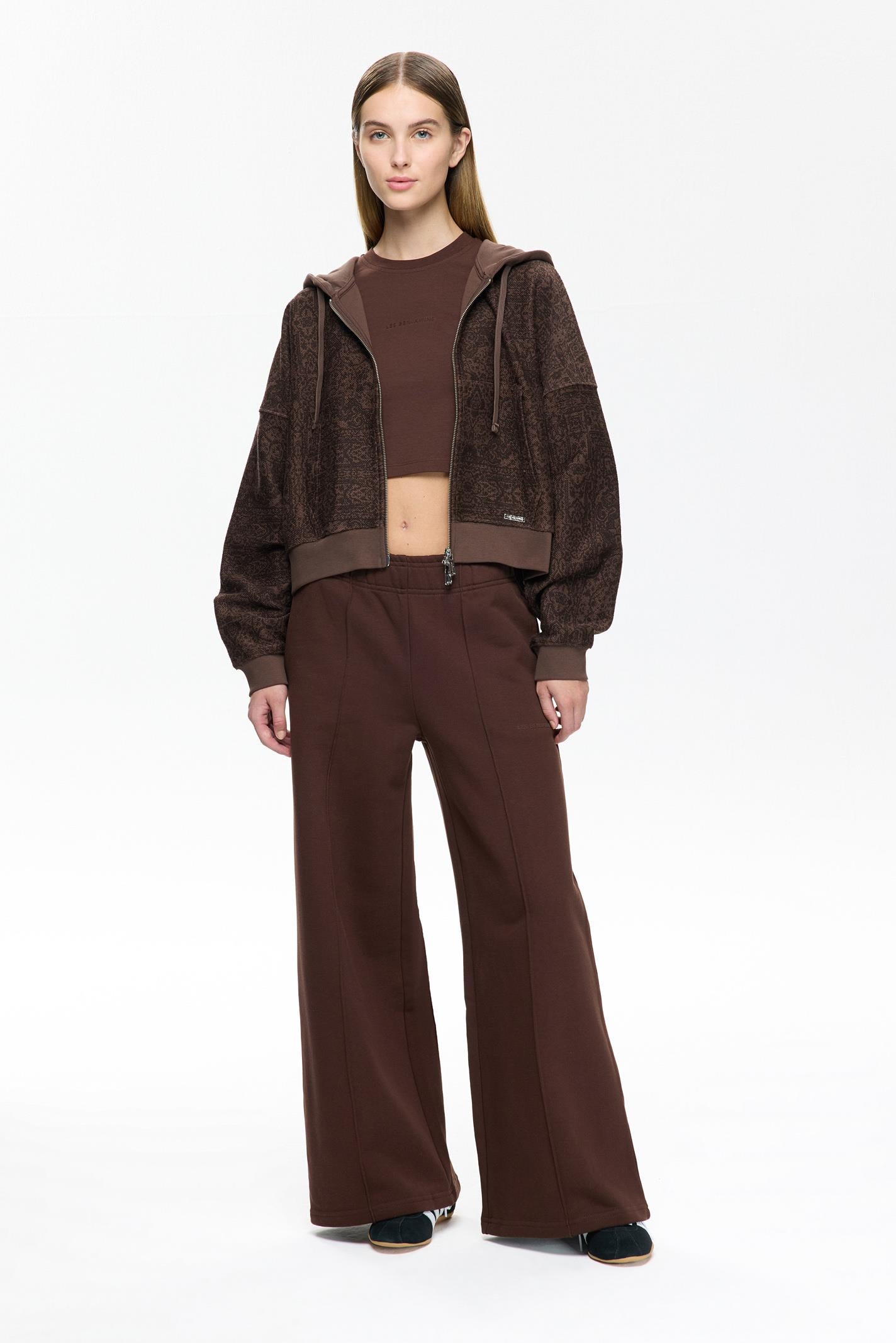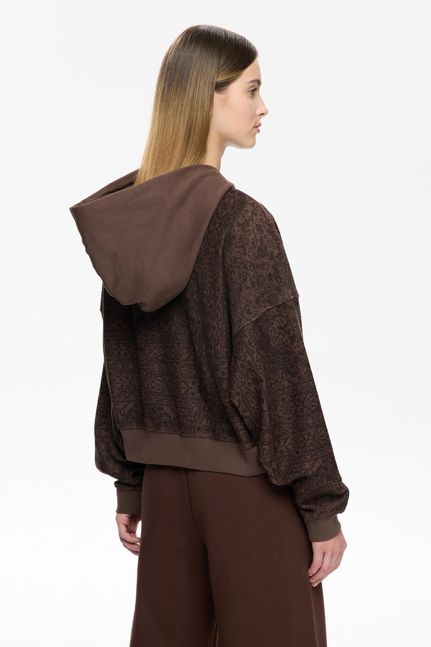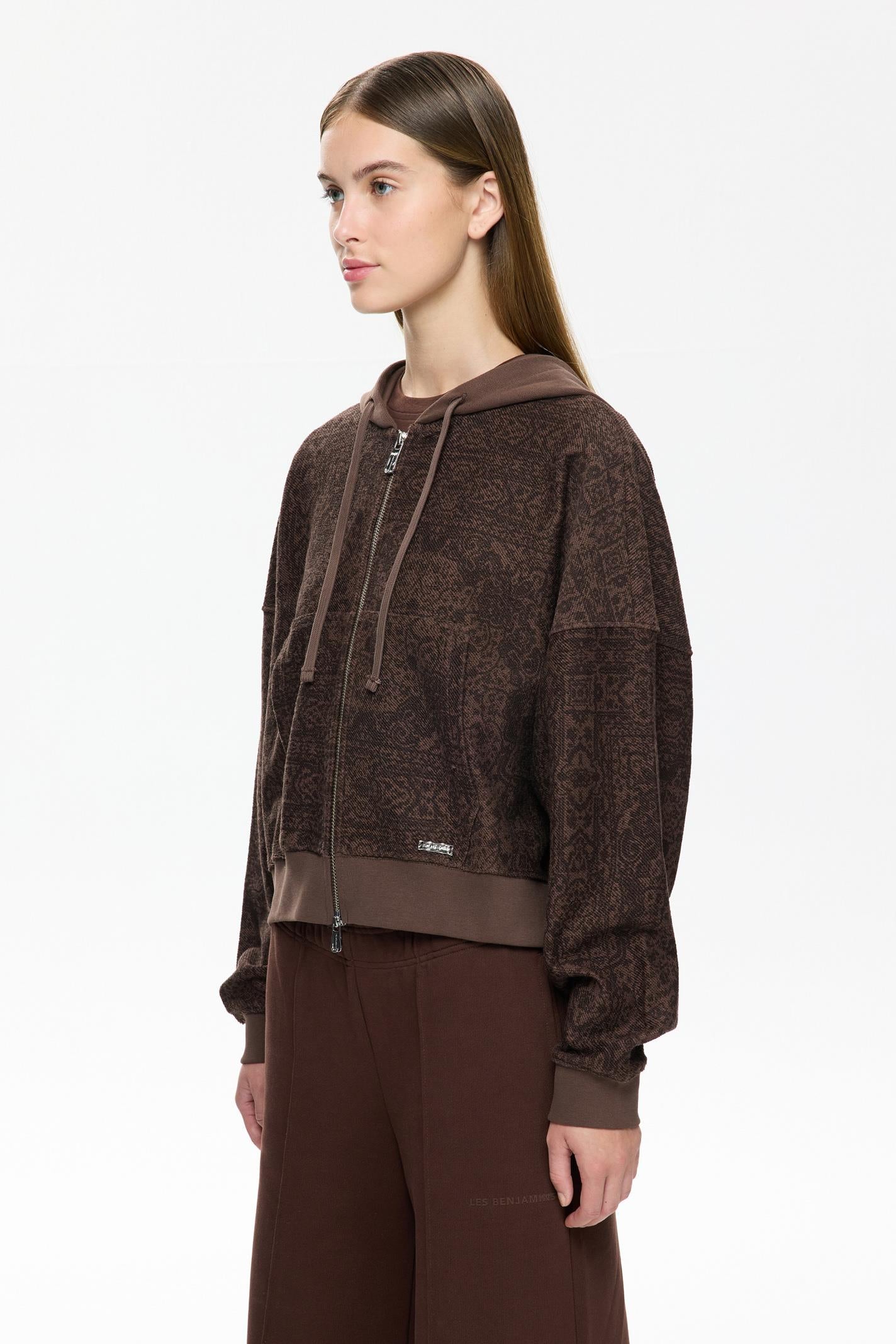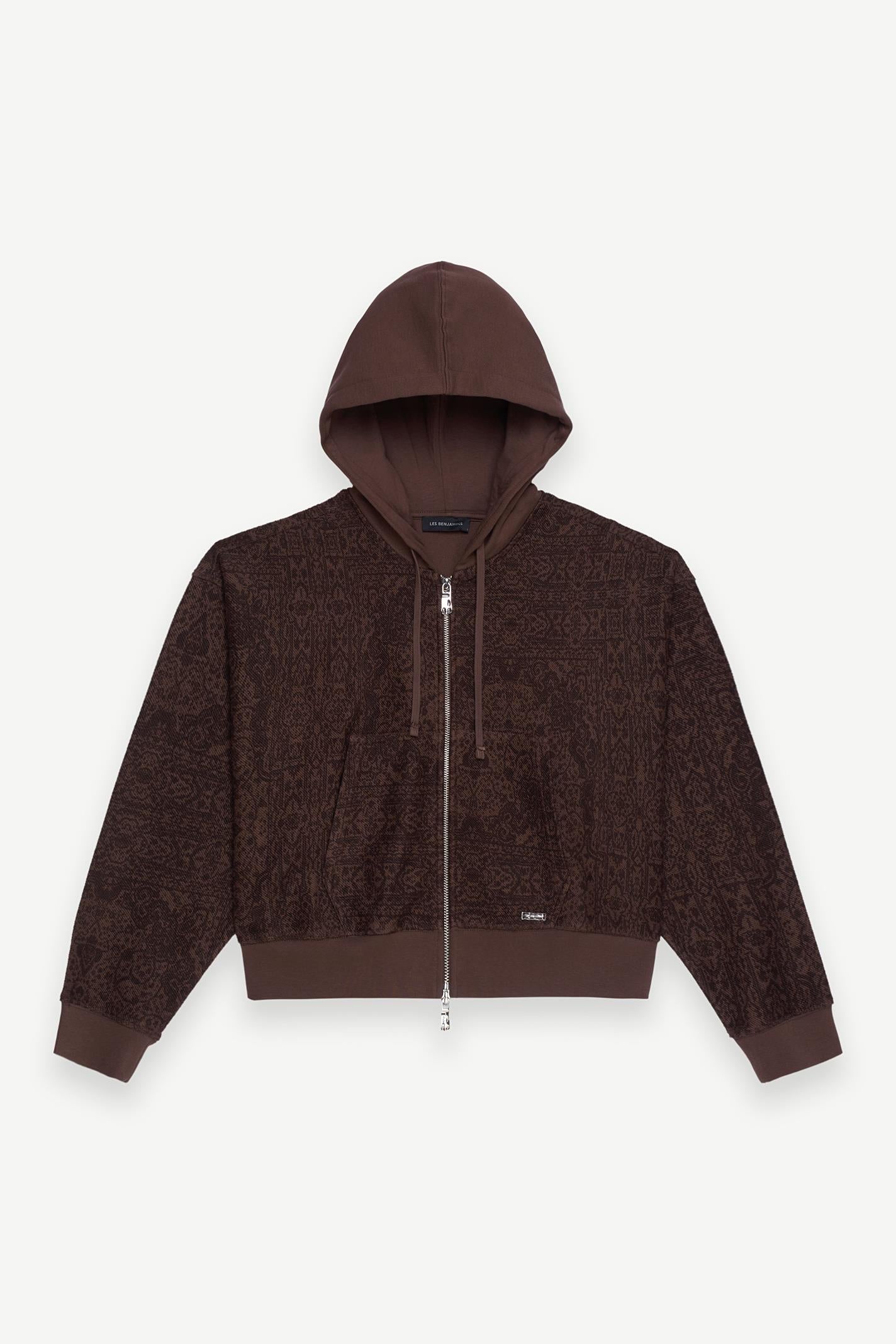 Bu Les Benjamins kapüşonlu sweatshirt, kahverengi tonlarında kültürel motiflerle zenginleştirilmiş desenleriyle dikkat çekiyor. Yumuşak jarse kumaşı, şehir hayatının dinamizmine uyum sağlarken, rahat kesimi ve kanguru cebi işlevsellik sunuyor. Küçük LES BENJAMINS logosu alt kısımda zarif bir dokunuş katıyor.